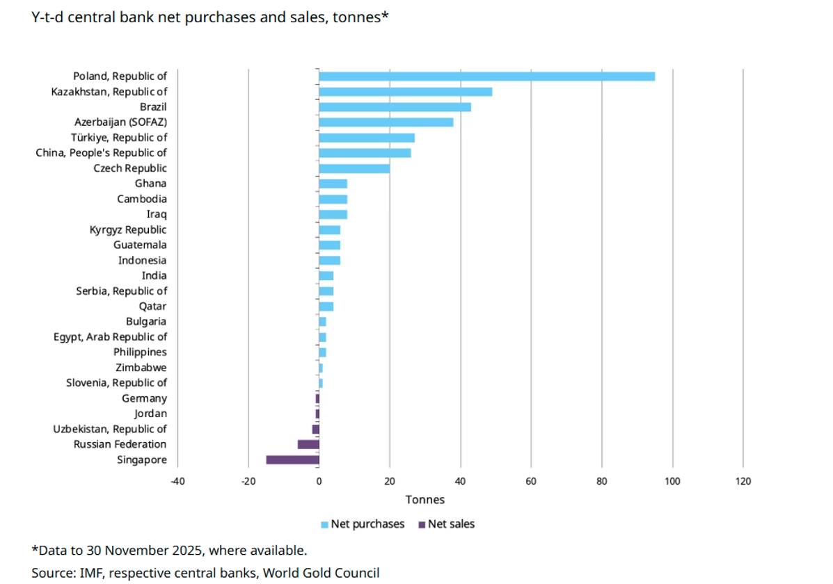 Poland led buyers with 90 tonnes, targeting 20% of reserves in gold. Turkey added almost 30 tonnes, and China officially accumulated almost the same amount.