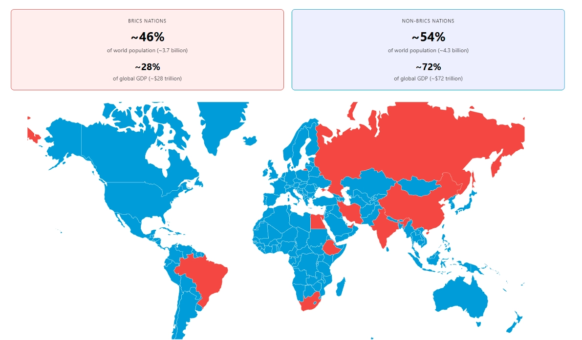 De-dollarization efforts, while gradual, are accelerating. BRICS nations now represent 46% of the world population and 28% of global GDP, with combined gold reserves exceeding 6,000 tonnes.