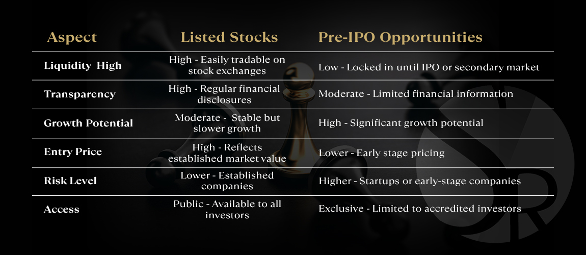 Listed stocks offer stability and liquidity, making them a safer bet for many investors, especially those who are in for the long game. However, if you’re seeking higher returns and are willing to embrace a higher level of risk, pre-IPO opportunities could provide the lucrative gains you’re after.