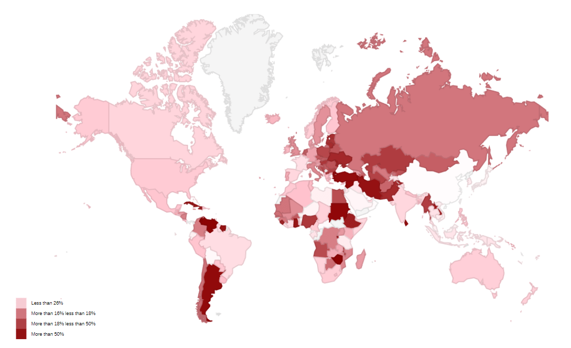 This map from December 2022 shows that, while North America and most of Western Europe have seen higher-than-usual inflation rates, these remain around or under the 15% mark. In contrast, inflation in developing countries concentrated in South Asia, the Middle East, Africa and South America is significantly higher, resulting in economic hardship along with unemployment, social unrest and political turmoil.