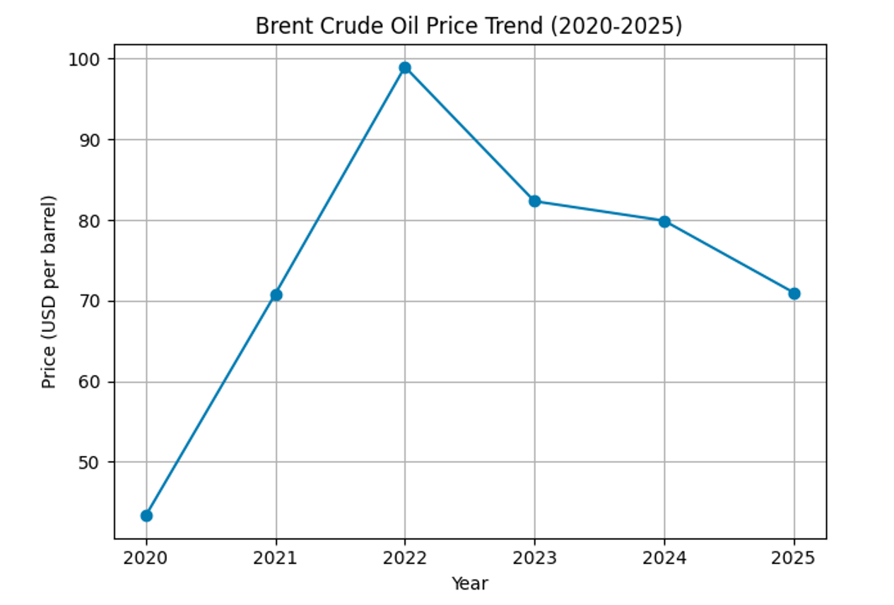 Brent crude prices have moved in a remarkable arc since the pandemic: from a collapse in 2020 to a brief run at triple‑digit highs in 2022 and a return to mid‑cycle levels in 2024–25. Data from the St. Louis Fed’s shows that Brent averaged almost $80/bbl in 2024, down from $82.3/bbl in 2023 and $99.0/bbl in 2022.