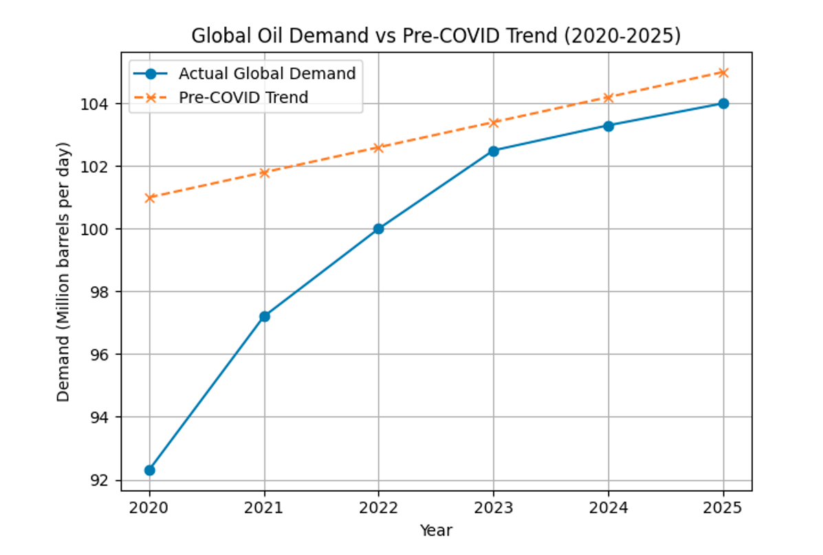 Figure 3 juxtaposes actual global demand growth with a simple projection of the pre‑COVID trend. The divergence highlights the pandemic‑induced demand destruction and the subsequent recovery; although demand surpassed its 2019 level by 2022, it remains about a million barrels per day below the path the world would have been on absent the pandemic.