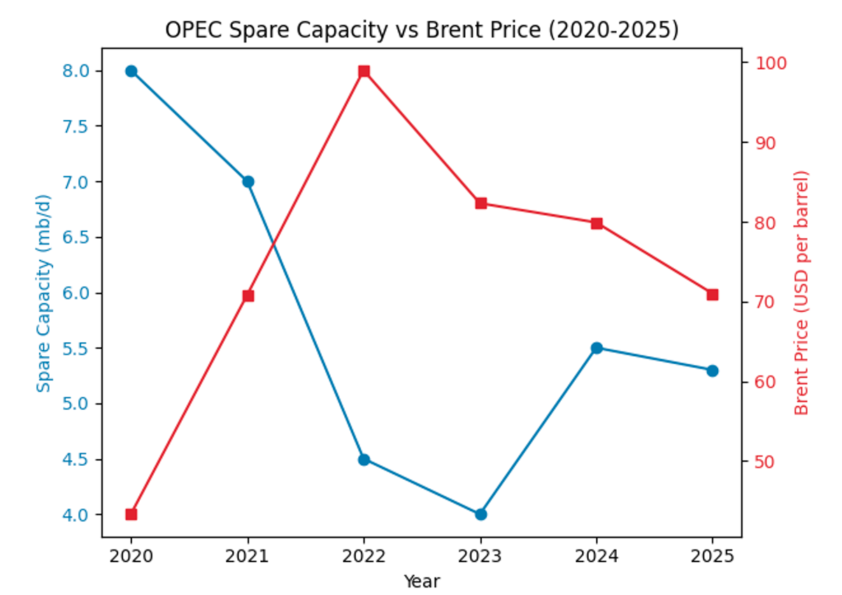 Figure 2 compares OPEC spare capacity with the Brent price trend. Spare capacity fell sharply after the pandemic as demand rebounded and OPEC+ cuts limited available cushion; it bottomed in 2022 at around 4 mb/d but expanded again in 2024–25 as new Gulf projects came online. The inverse relationship between spare capacity and price highlights OPEC’s influence: when spare capacity is plentiful, prices tend to be lower, and vice versa.