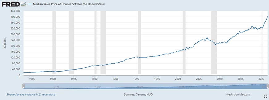 To get a better understanding about how prices in the real estate sector tend to rise over time. Let us look at the all time median housing price chart.