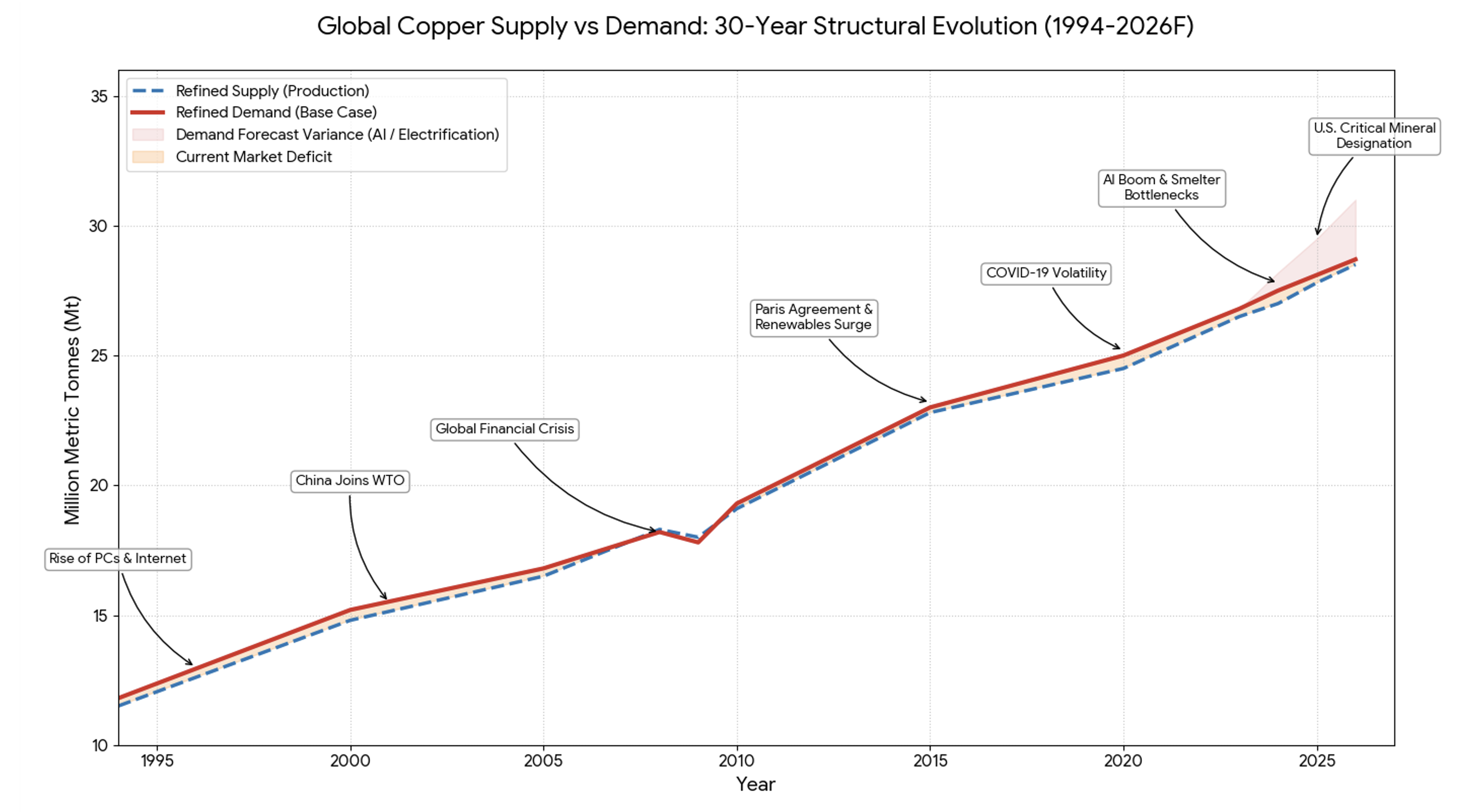 The following 30-year data highlights a clear shift in the copper market's fundamental balance. From 1994 through the early 2020s, refined supply and demand largely moved in tandem, with periodic surpluses absorbing short-term shocks.