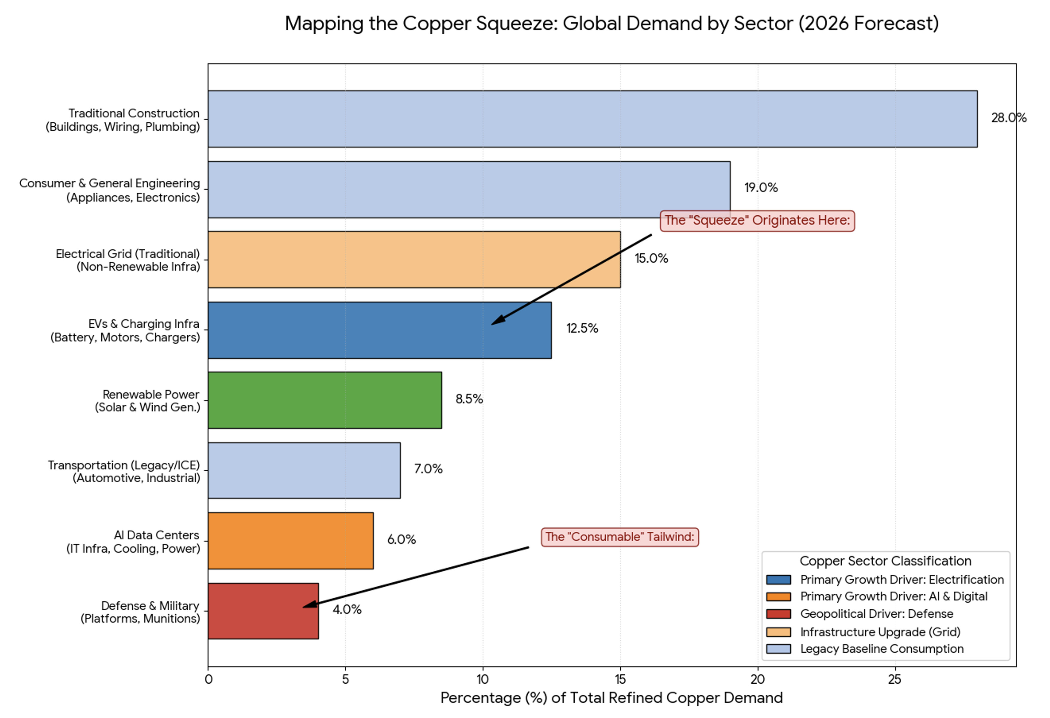 Global rearmament is a third structural tailwind for copper that is frequently underappreciated. Rising geopolitical tensions across Eastern Europe and the Indo-Pacific have prompted NATO members and allied nations to substantially increase defence budgets. Modern military platforms, from fighter aircraft and naval vessels to missile systems and surveillance infrastructure, are highly copper-intensive.