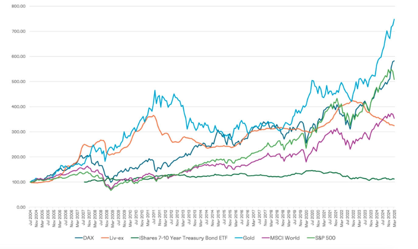 Between 2005 and 2024, the Liv-ex Fine Wine 100 index surged by over 270%, outperforming global equities and gold in risk-adjusted terms. Unlike stocks or crypto, fine wine prices tend to move independently from financial markets, with a near-zero correlation to the S&P 500.