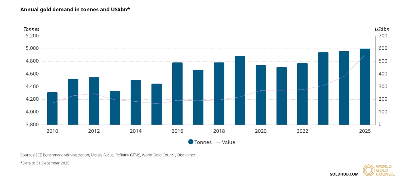 J.P. Morgan projects combined investor and central bank demand averaging roughly 585 tonnes per quarter. Natasha Kaneva, the bank's Head of Global Commodities Strategy, stated: "We expect gold demand to push prices toward $5,000/oz by year-end 2026", a target gold has already exceeded.