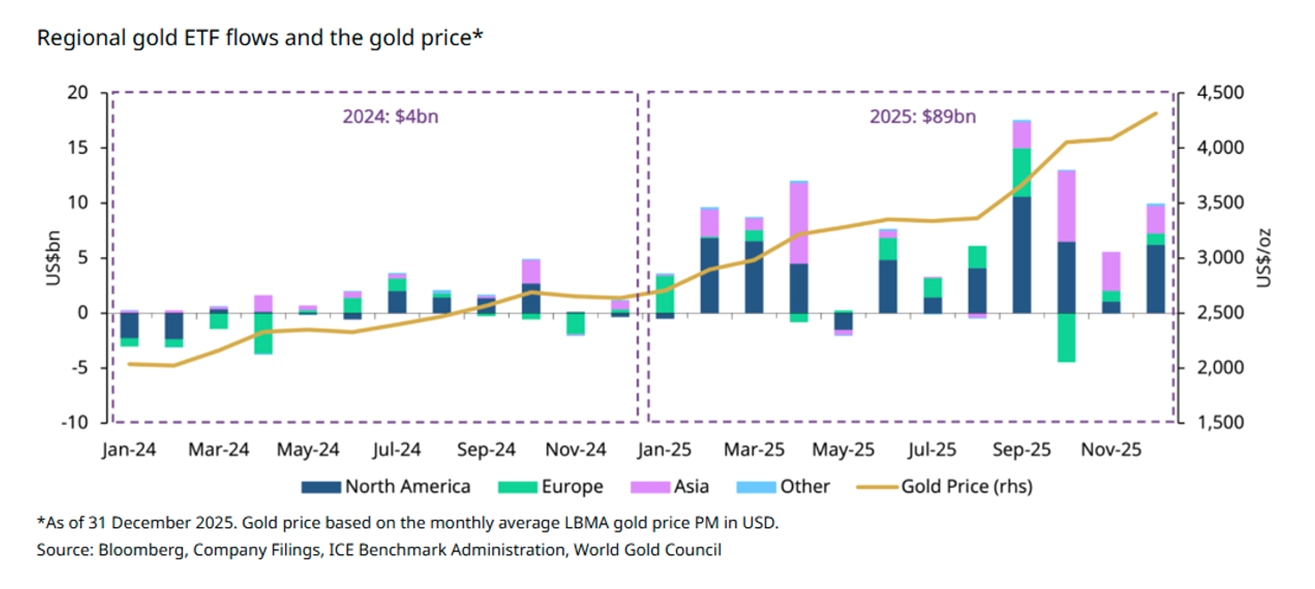Second, investment demand hit records with global gold ETFs attracting $89 billion in 2025, with holdings growing by 801 tonnes. North American funds alone saw $51 billion in inflows. Even during the January 30 selloff, leading U.S. gold ETFs did not report outflows.