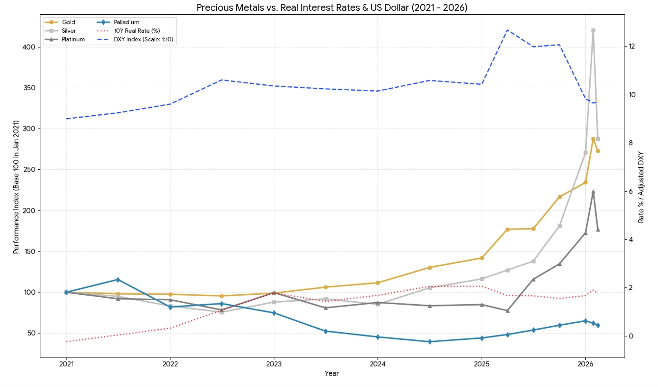 The one force that could reverse the rally: a meaningful rise in real interest rates. If inflation cools faster than expected while the Fed pauses or reverses course, positive real rates would increase the opportunity cost of holding non-yielding metals.